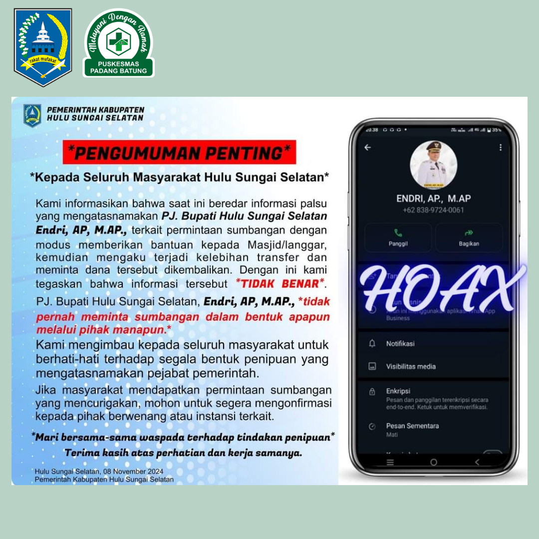 Kami informasikan bahwa saat ini beredar informasi palsu yang mengatasnamakan PJ. Bupati Hulu Sungai Selatan, Endri, AP, M.AP., terkait permintaan sumbangan dengan modus memberikan bantuan kepada Masjid/langgar, kemudian mengaku terjadi kelebihan transfer dan meminta dana tersebut dikembalikan. Dengan ini kami tegaskan bahwa informasi tersebut âď¸TIDAK BENARâď¸